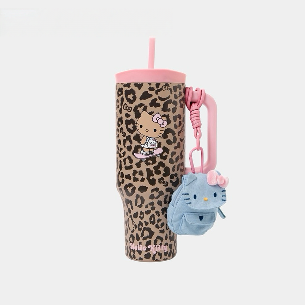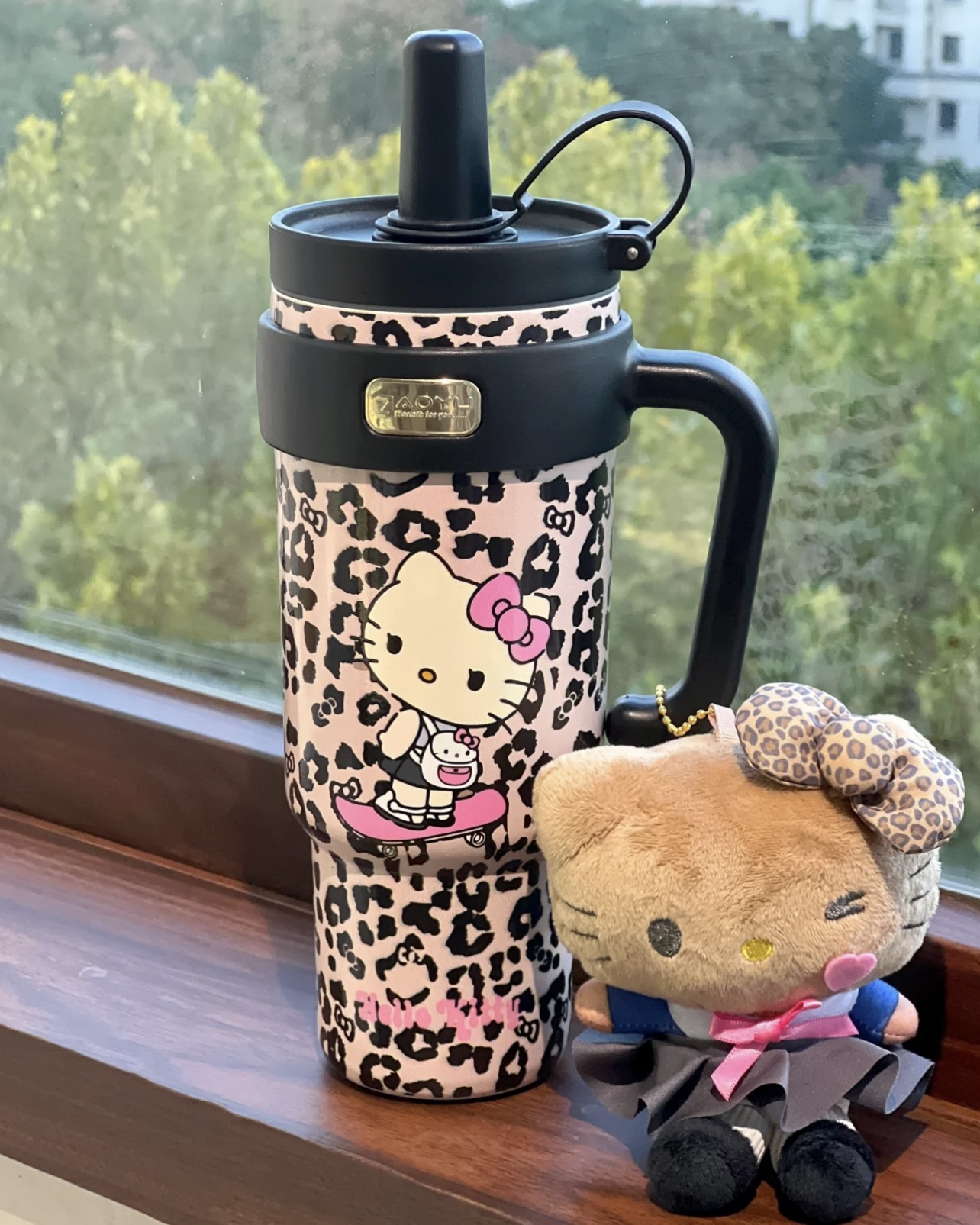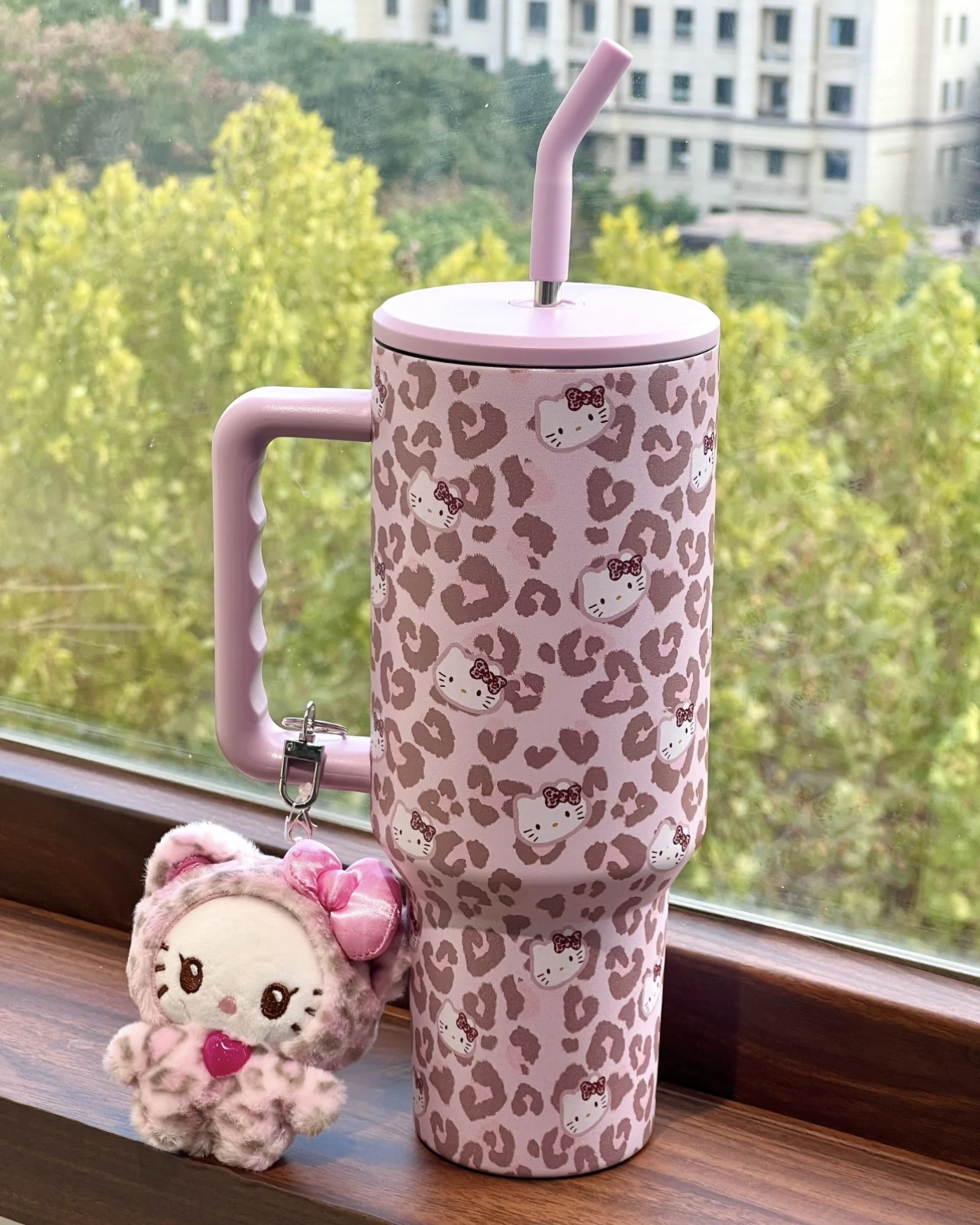 Leopard Print Hello Kitty Large-Capacity Straw Cup, Cute & Portable 316 Stainless Steel Vacuum Insulated Mug