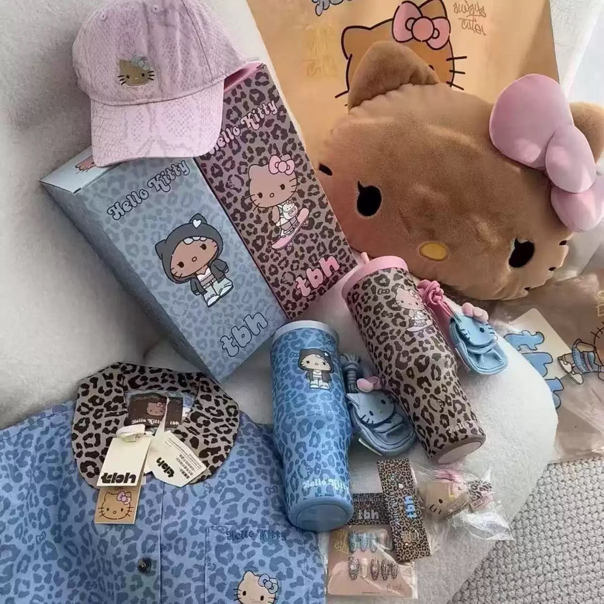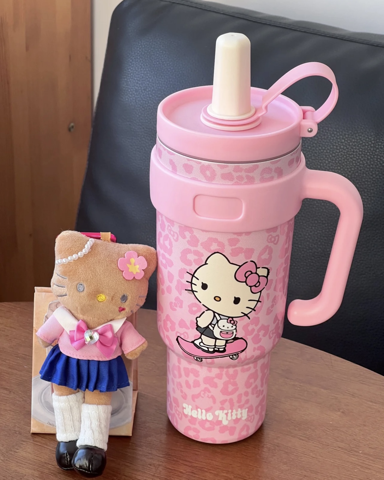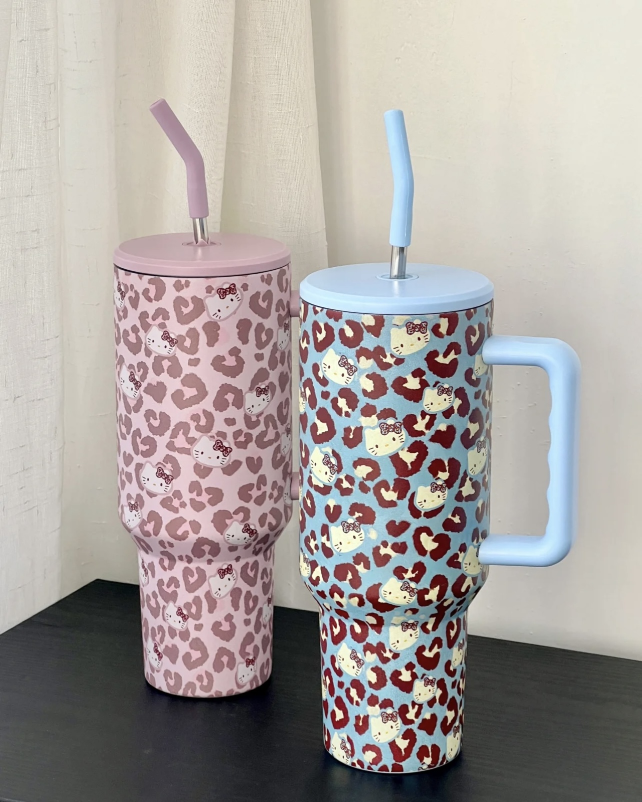 Leopard Print Hello Kitty Large-Capacity Straw Cup, Cute & Portable 316 Stainless Steel Vacuum Insulated Mug
