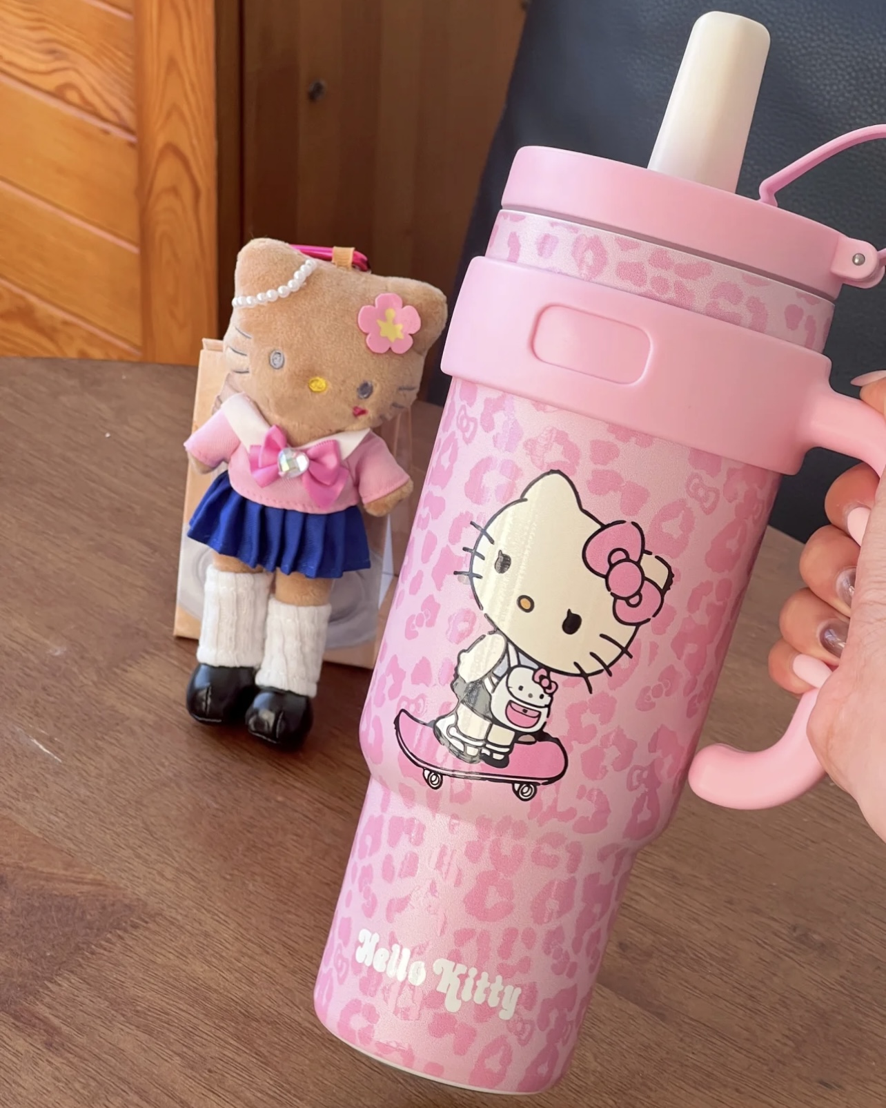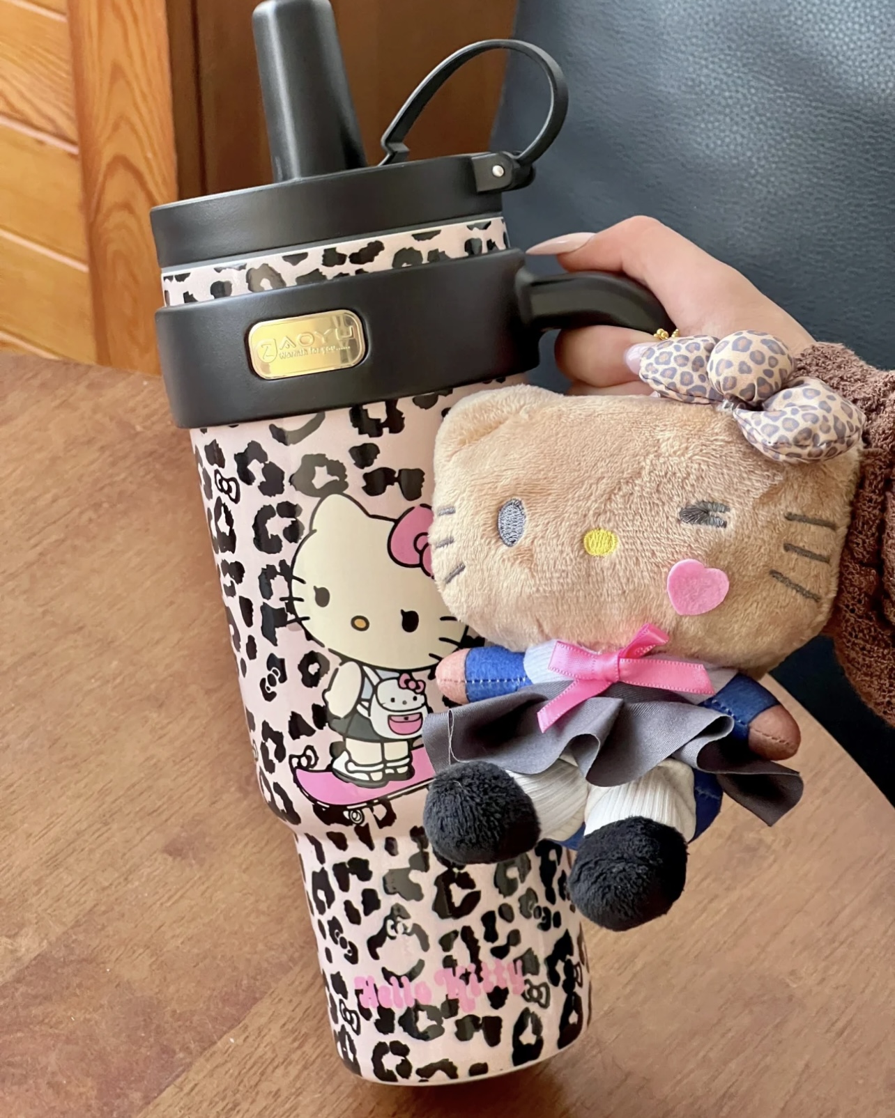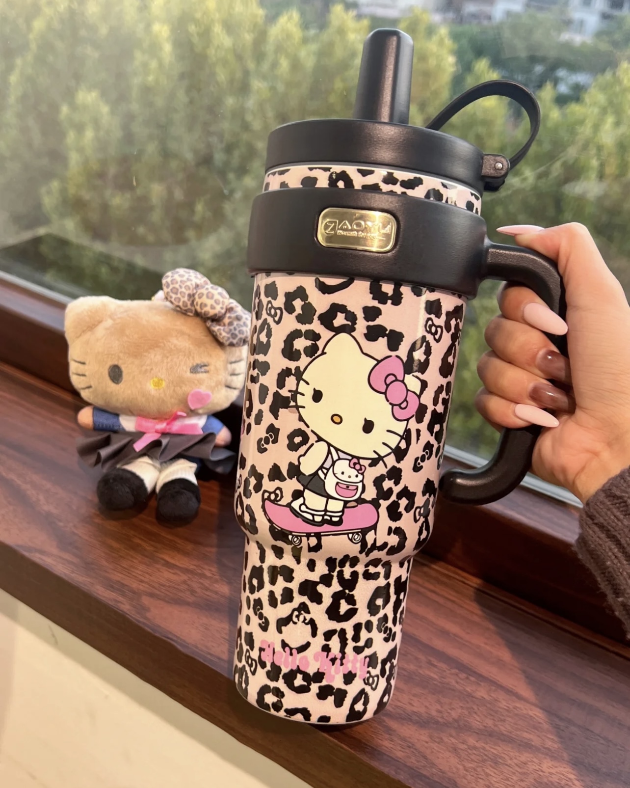 • Leopard Print Hello Kitty Large-Capacity Straw Cup, Cute & Portable 304 Stainless Steel Vacuum Insulated Mug