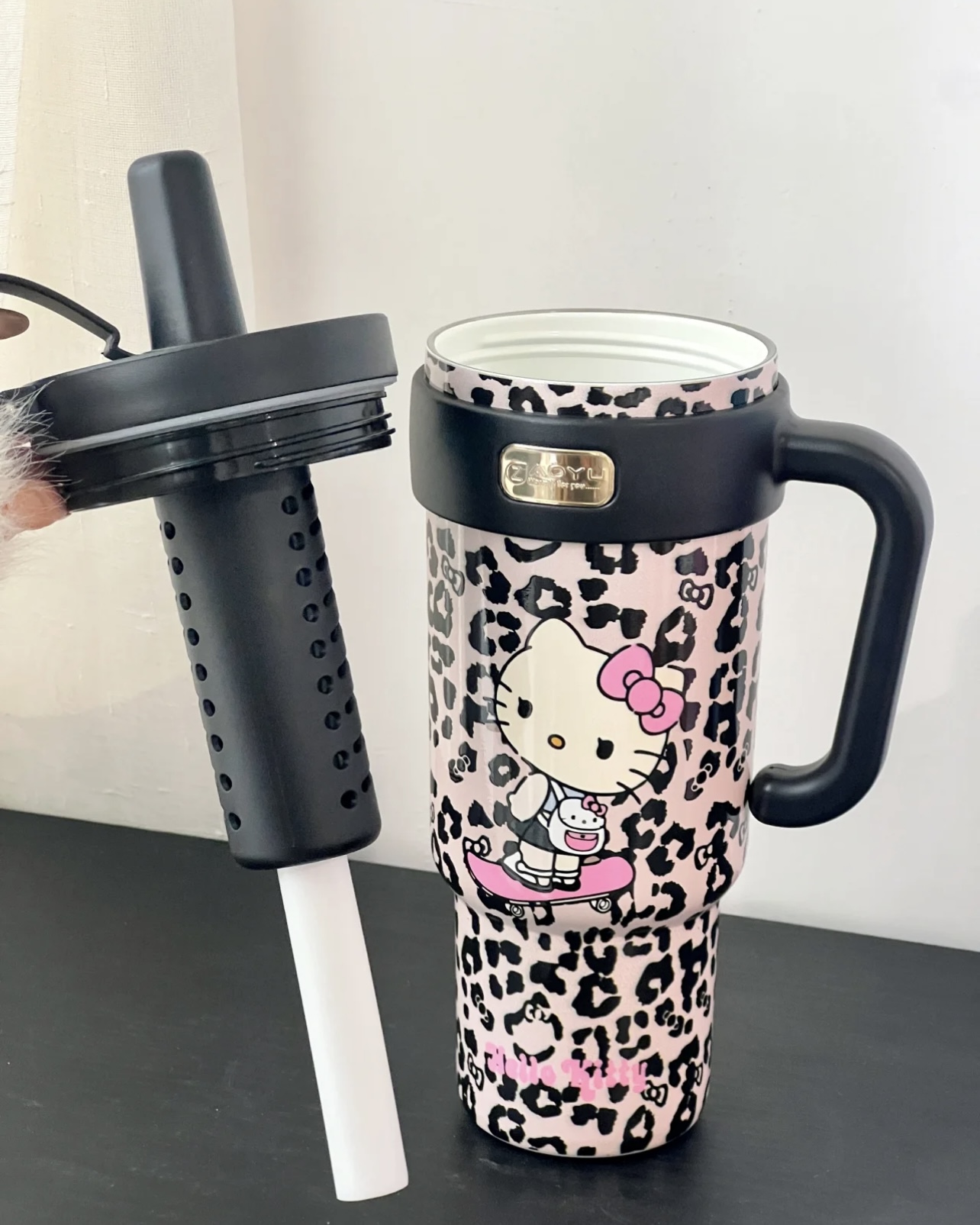 Leopard Print Hello Kitty Large-Capacity Straw Cup, Cute & Portable 304 Stainless Steel Vacuum Insulated Mug