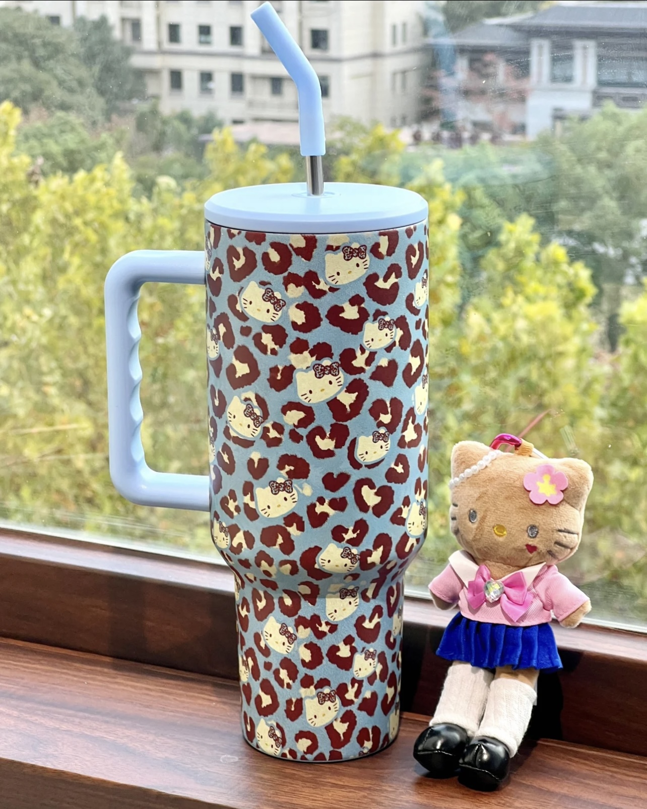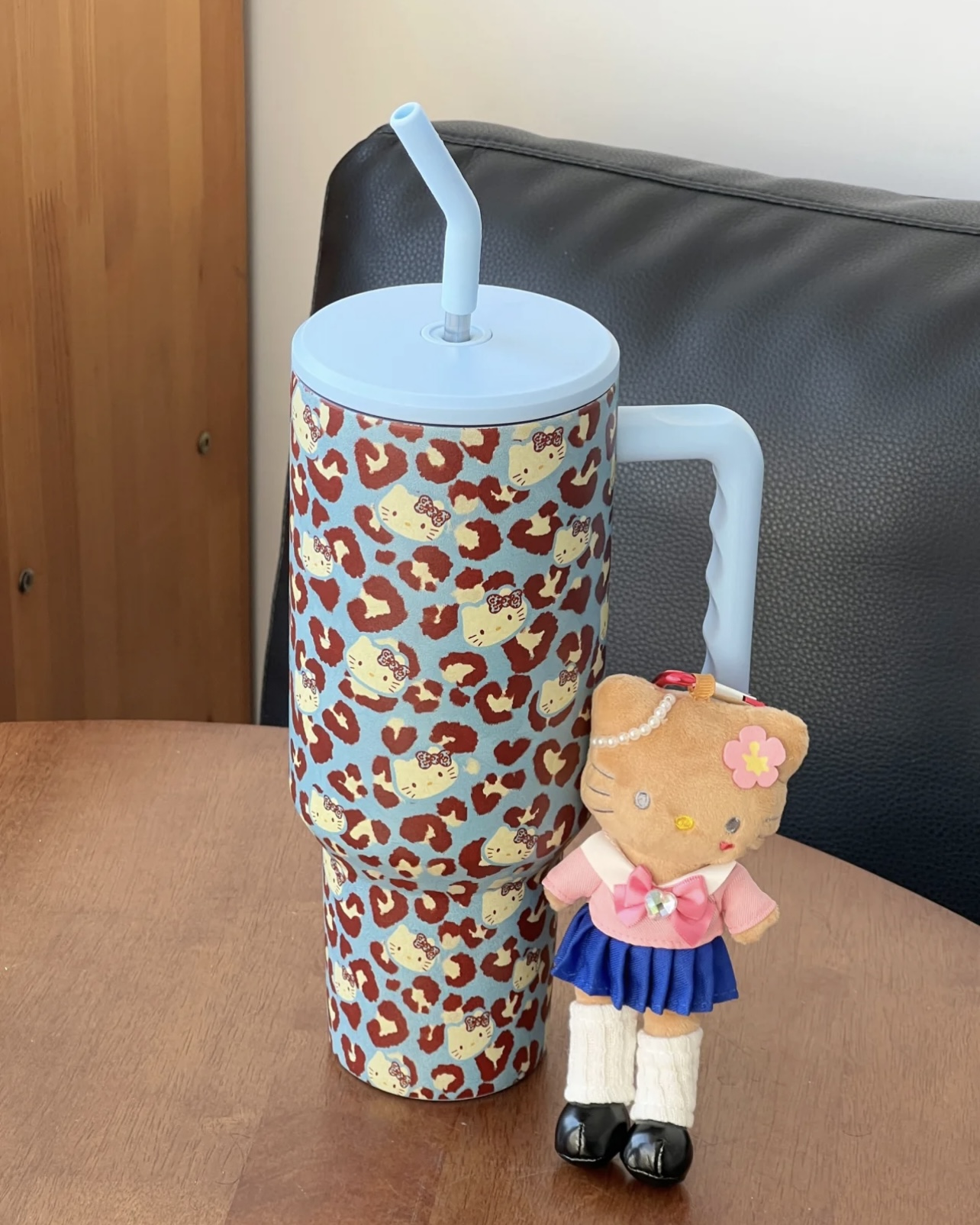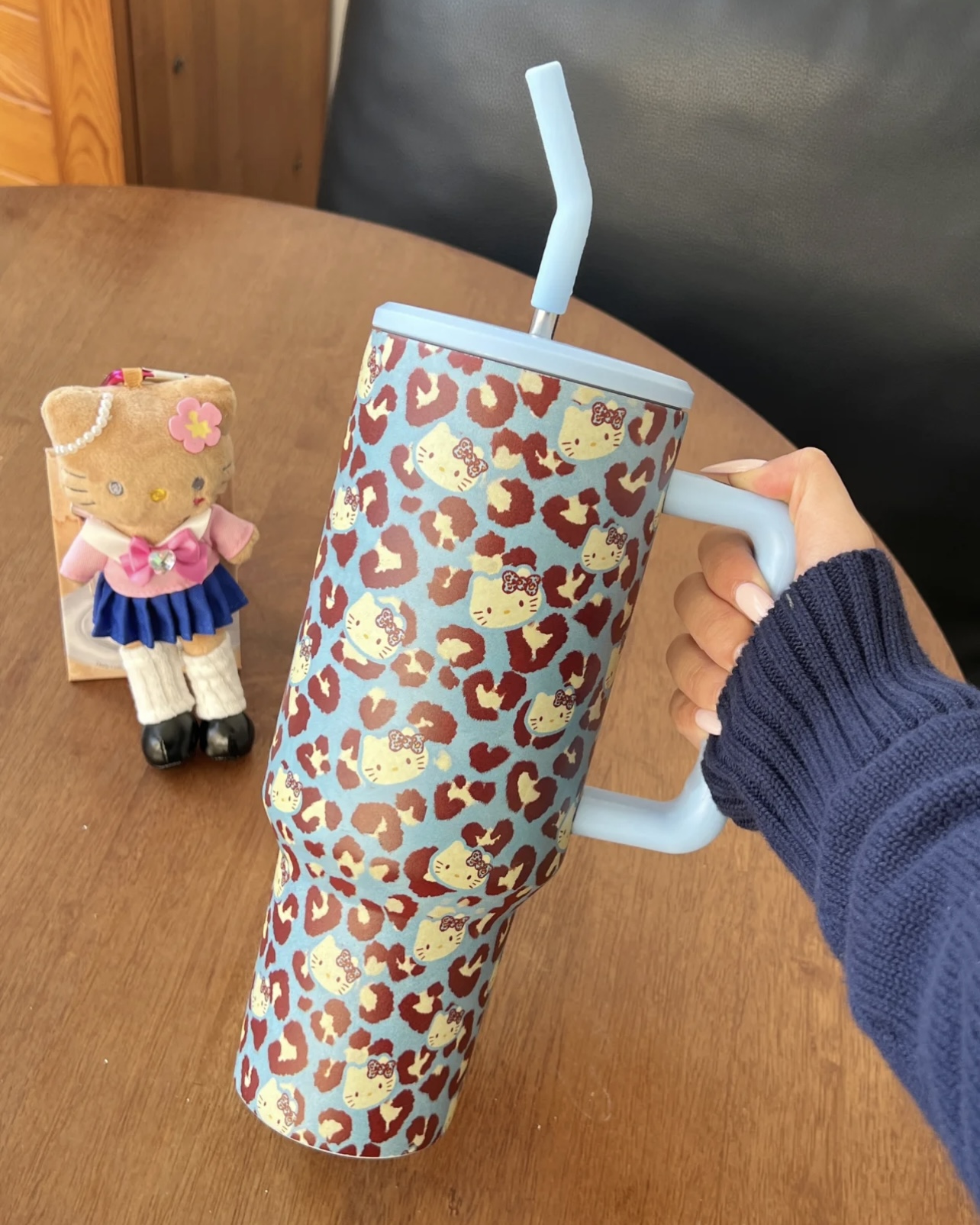 Leopard Print Hello Kitty Large-Capacity Straw Cup, Cute & Portable 316 Stainless Steel Vacuum Insulated Mug
