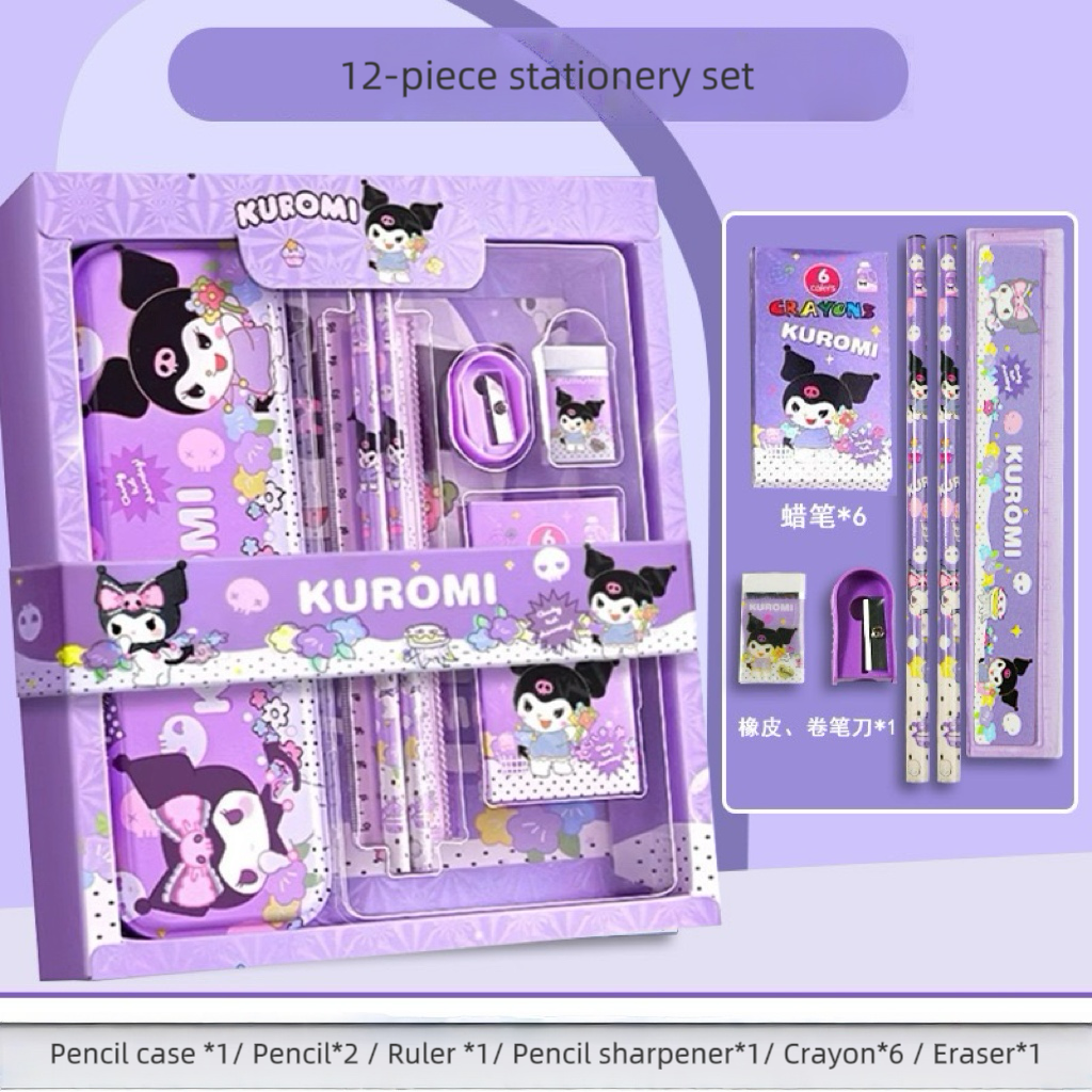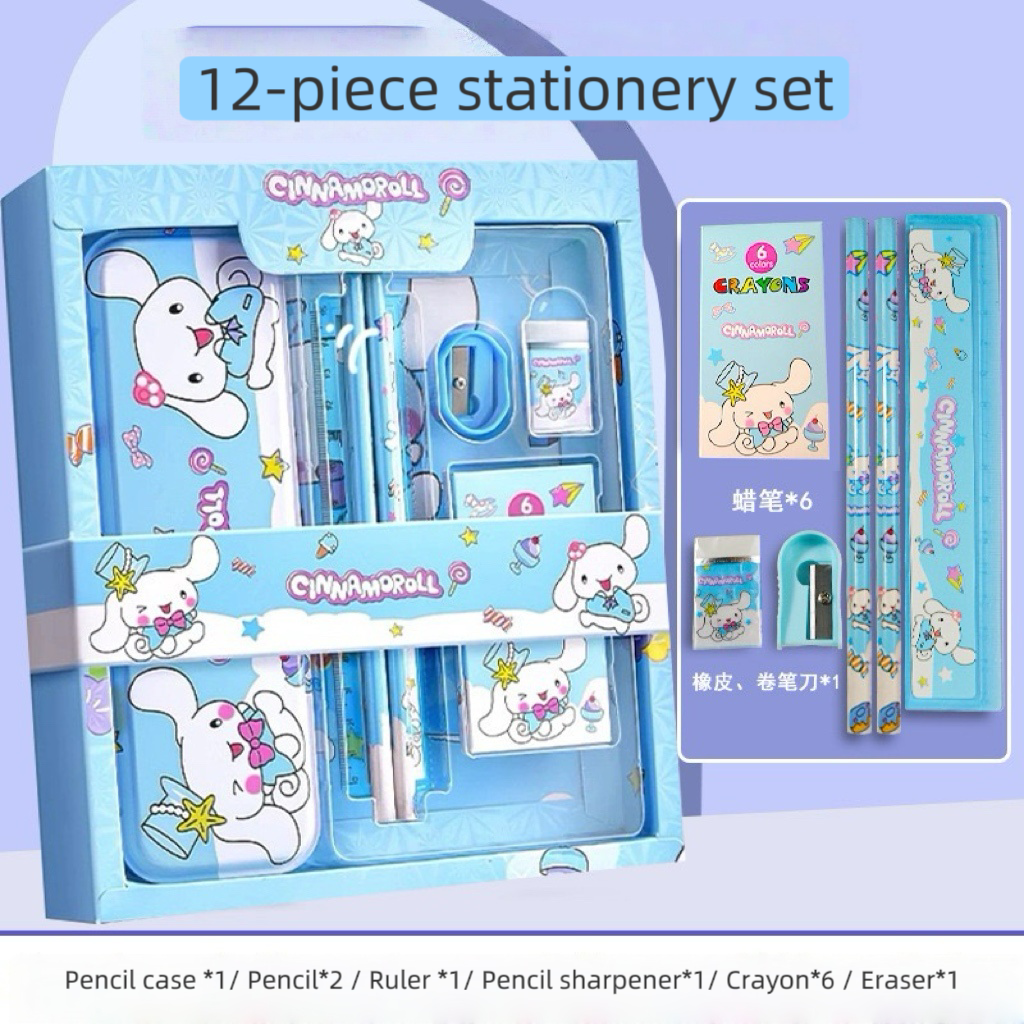 12-Piece Set:Pencil case *1/ Pencil*2 / Ruler *1/ Pencil sharpener*1/ Crayon*6 / Eraser*1