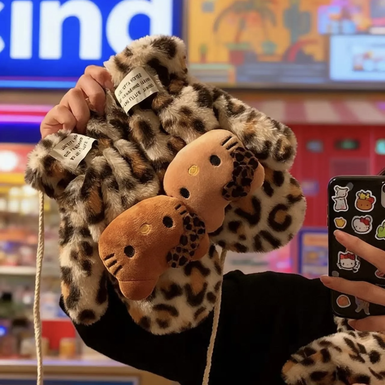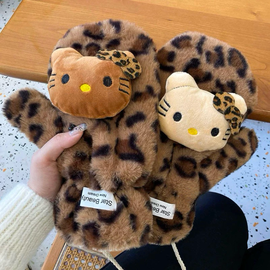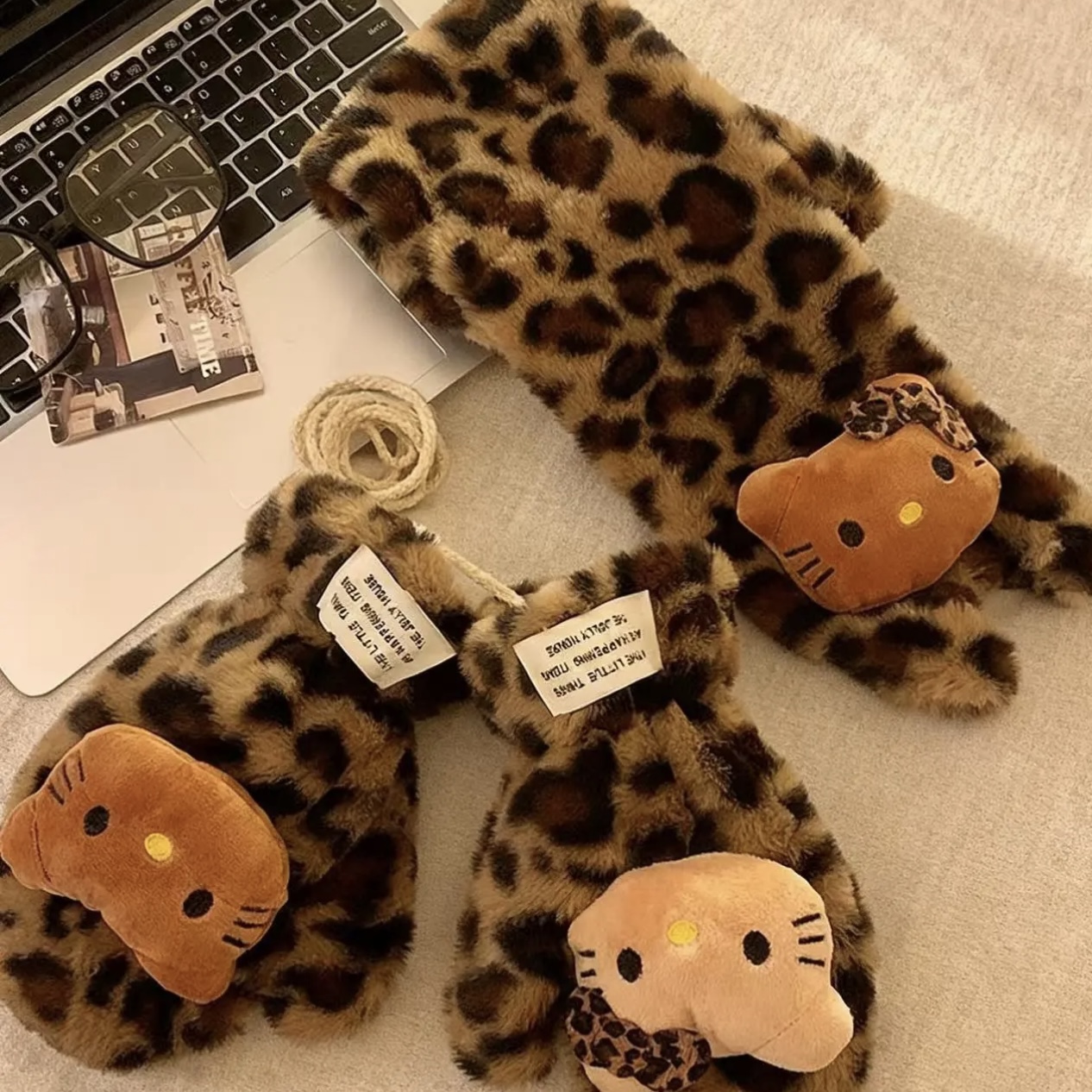 • Cute Leopard Print Hello Kitty Fleece Gloves, Winter Warm Scarf