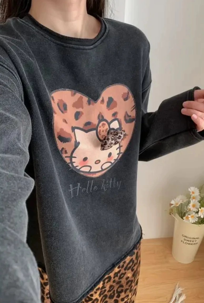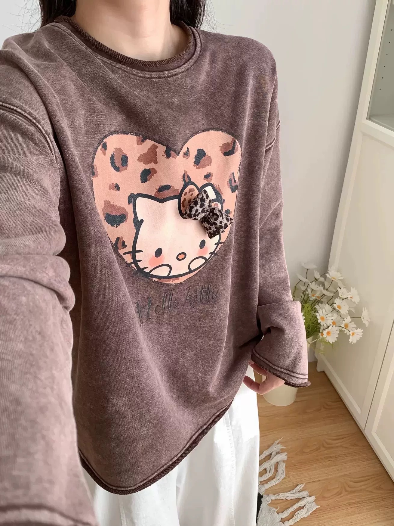 • Leopard Print Hello Kitty Garment-Washed Dyed Crewneck Sweatshirt