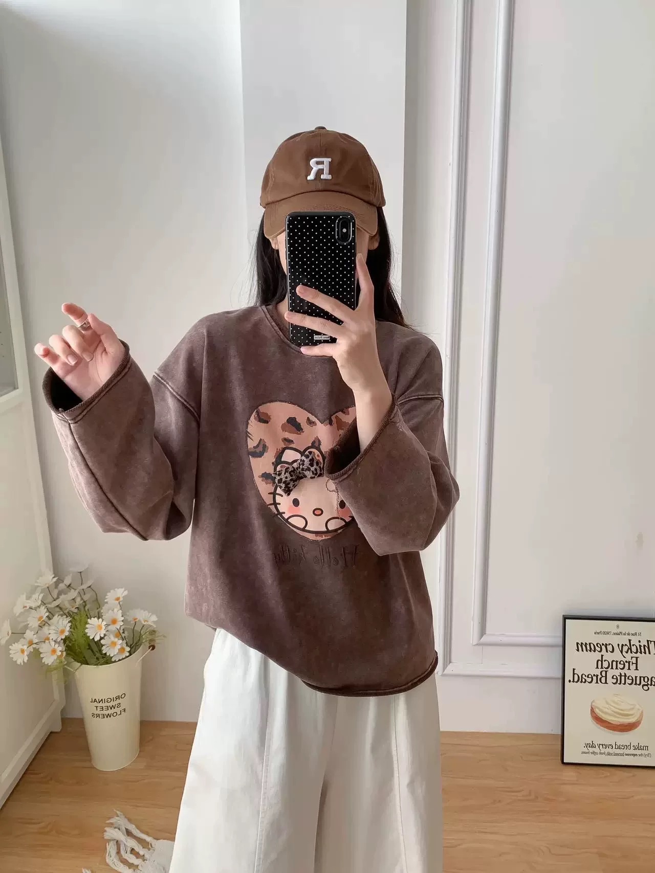 Leopard Print Hello Kitty Garment-Washed Dyed Crewneck Sweatshirt